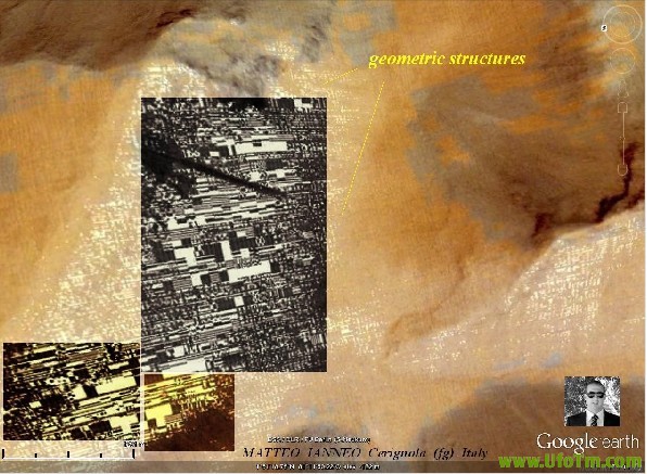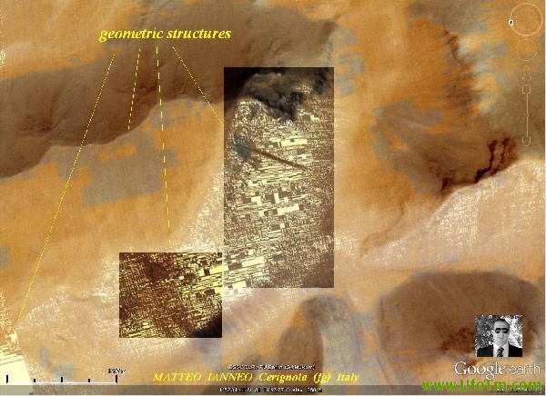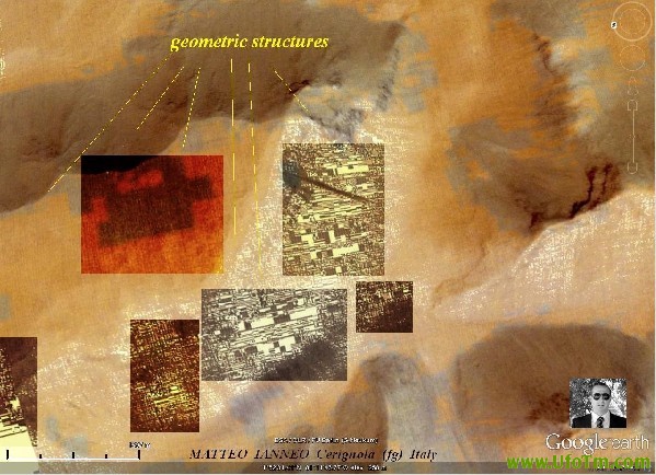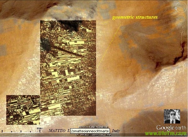 去年,意大利研究员Matteo Ianneo 发现了火星上5个看起来像人类的面孔,现在他又发现了一些惊人的有趣的构造。他声称在火星上找到看起来象一个城市的几何结构。这次新发现的“城市”和他的首次发现相隔一年,在2011年4月他曾在火星上发现一个水晶般透明的“面孔”(雕像),看起来比著名的基多尼亚火星面孔好看多了。