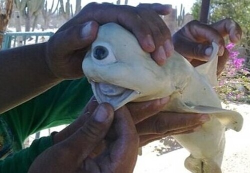 在墨西哥发现的一个罕见的鲨鱼胎儿,身长22英寸(约合56厘米),只有一只眼睛,长在头部前部。