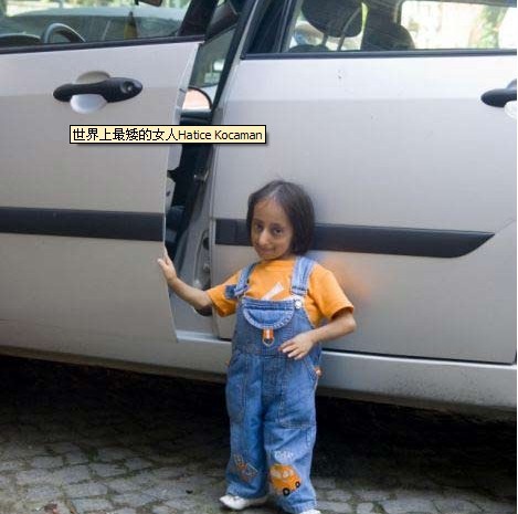 21岁的土耳其女孩Hatice Kocaman 近日荣获了“世界上最矮的女人”吉尼斯世界纪录,她的身高只有28英寸(约合71厘米),她仅仅比今年刚荣获“世界上最矮的人”,尼泊尔男孩Khagendra Thapa Magar(65厘米)高几公分。