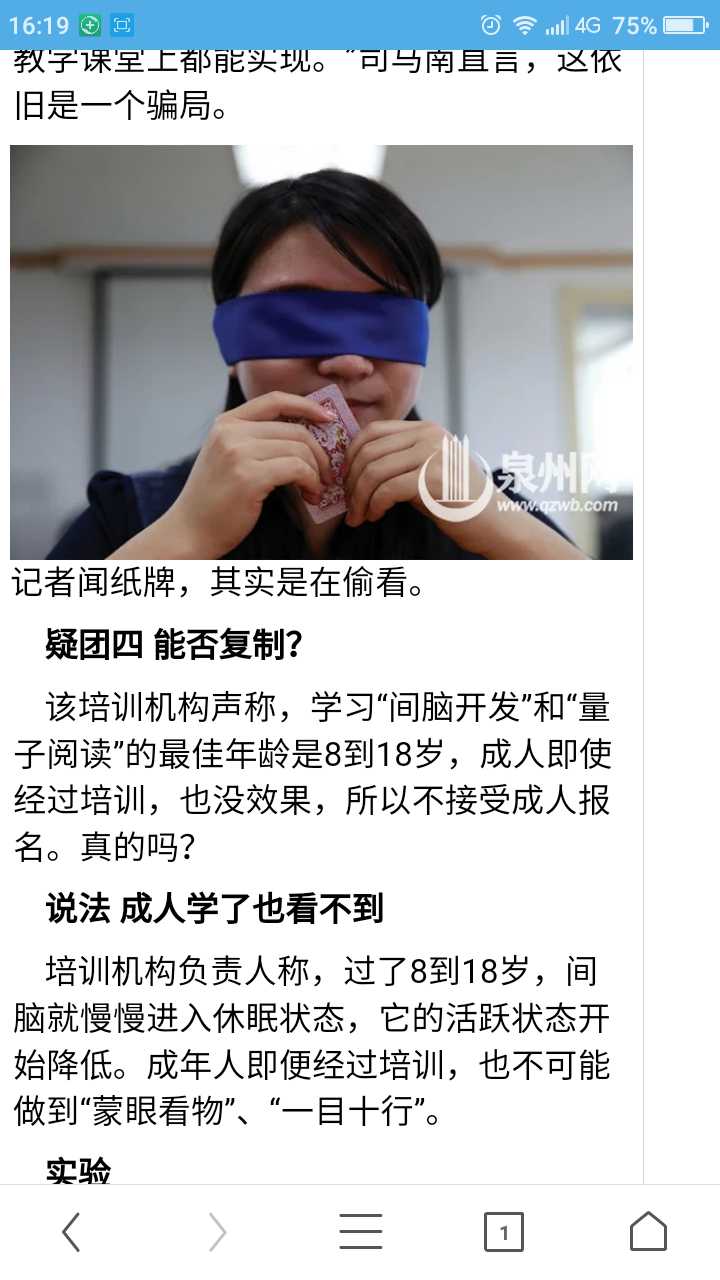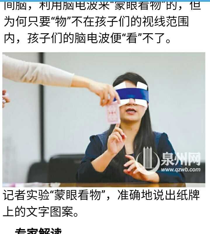 例如,2013年10月27日,《温州都市报》发表题为《蒙眼识牌漏洞百出 校方声称舟车劳顿》的文章中提到,当地一家少儿培训机构提供一种“超强感应”脑波培训,经过培训的学生会拥有“蒙眼识牌”的特殊能力,该机构演示的“蒙眼识牌”过程与网传视频中的一模一样。当地媒体记者进行现场测试,稍稍改变了一下规则,直接抽取一张扑克牌放在这位拥有“特殊能力”的学生的额头上,不给他有任何偷看作弊的机会。学生对额头上的牌“感应”了足足2分钟,还是无法说出颜色。媒体记者进行多次测试后,结果都是如此。所谓的“蒙眼识牌”把戏被拆穿:学生把牌放在胸前位置,刚好是眼罩漏光处可观察的范围,他看到牌的花色后,再在额头象征性地擦拭一下,谎称“靠额头感应辨识”。(本文来源ufo110线索网http://www.ufo110.net/)