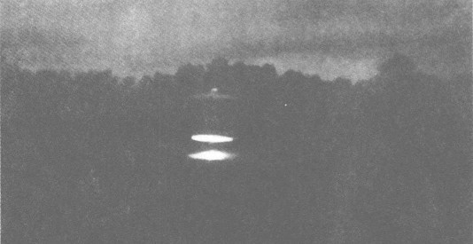 爱德华·沃特著名的19号照片(上图)。这是佛罗里达州风湾镇飞碟照片中**争议的一张。这里灯光被加强了以显示细节,但这张照片被资深相片技师威廉·海泽指责为是通过多次曝光伪造的,而另一个光学专家布鲁斯·麦克比又确认为是真的。一个电视台新闻报道员马克·科帝斯假造了一张相似的照片(下图)来证明这是可以假造的。