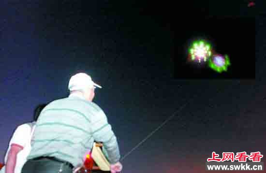 根据不明飞行物大概的方位,记者跟着“飞行物”方向一路寻找,发现不明飞行物就在火车头体育场上空附近,体育场内有人在放夜风筝。原来灯光是夜风筝上夜光设备不断地发出不同颜色的光。