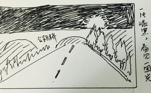 这是我坐的副驾驶座向外看的视角,一开始看见公路桥那边有刺眼的一团光,以为是山上的探照灯