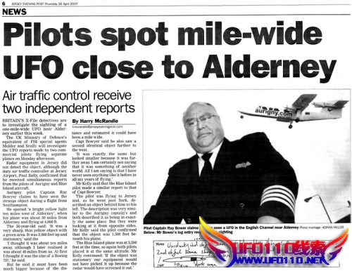 飞行员的飞碟冲击 乔尔·沃尔夫森 不明飞行物目击事件正在调查国防部 两个单独飞行经验的航空公司飞行员看到的东西了周一下午1英里宽的奥尔德尼海岸。 令人惊讶的是,新泽西州的雷达设备,也没有挑了对象,虽然空中交通管制员说,他已收到的Aurigny和蓝群岛飞行员同时报告。#p#副标题#e#
